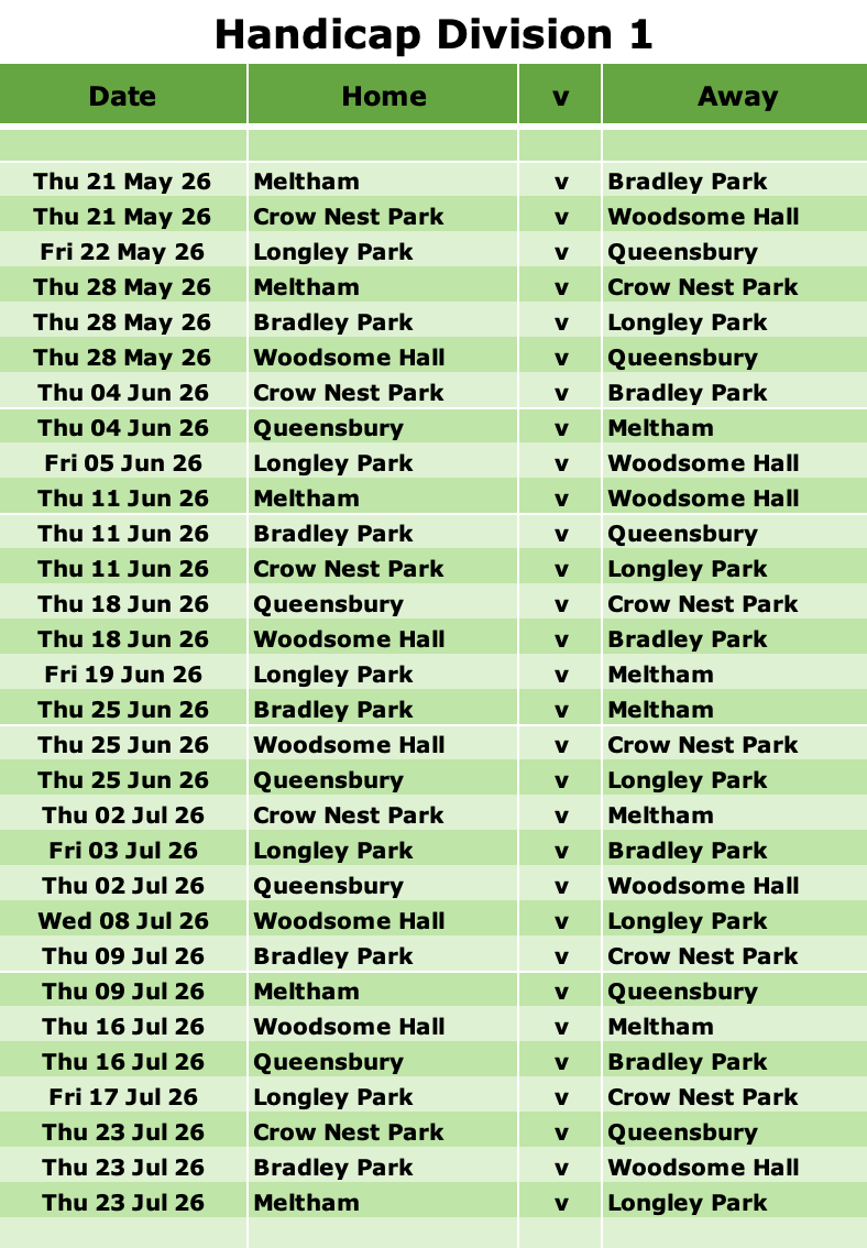 | 2025-05-29 17:30:00May 29, 2025 | Queensbury  | 2 - 6 | Longley Park | 17:30:0017:30 | Queensbury Golf Club |