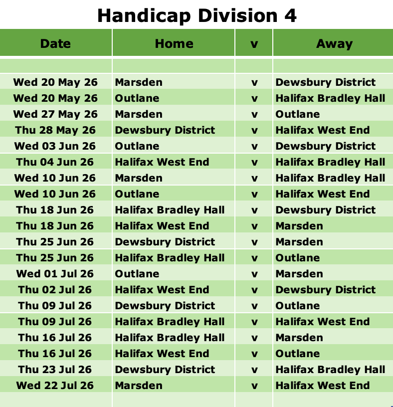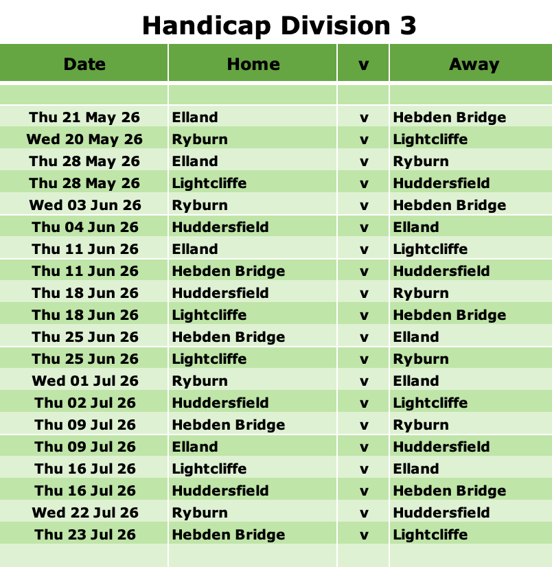 | 2025-06-26 17:30:00June 26, 2025 | Halifax  | 6 - 2 | Bradley Park | 17:30:0017:30 | Halifax Golf Club |